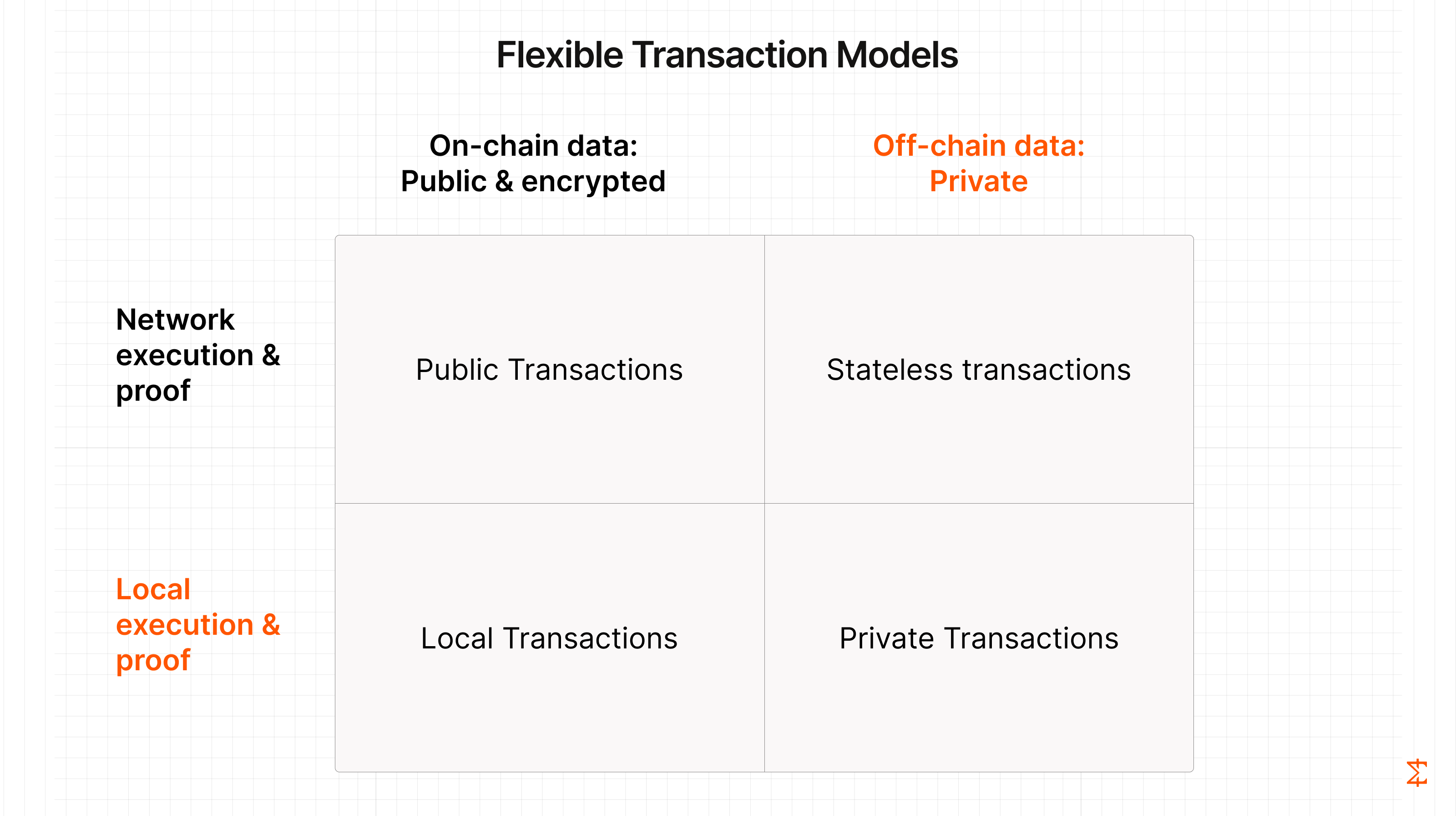 Public storage implies no privacy, as all data is stored onchain and visible to everyone. Encrypted data storage also means all data is onchain, but it only provides visibility to those with the decryption key without offering scalability gains. offchain storage ensures the network only knows a commitment to the real data, with users storing the data elsewhere. This approach—combined with client-side proofs—significantly boosts privacy and scalability, as the network has fewer storage and computation requirements.